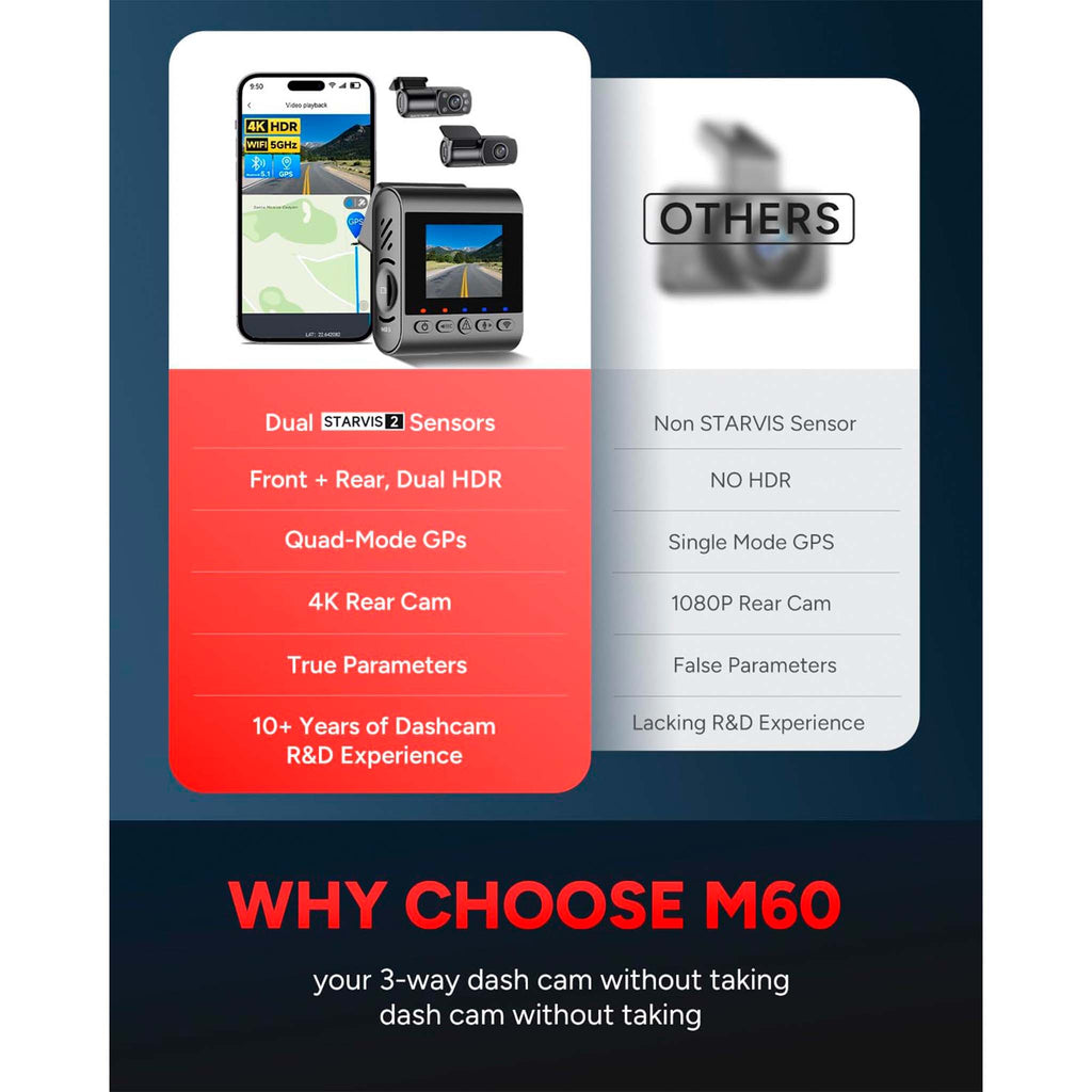 SJCAM M60 on huippuluokan kojelautakamera, joka tallentaa liikennettä kristallinkirkkaalla 4K-resoluutiolla. Huippulaadukas Sony Starvis 2 -sensori ja erittäin laaja 170 asteen kuvakulma varmistavat, että pienimmätkään yksityiskohdat eivät jää tallentamatta. Jatkuva, automaattinen tallennus "loopilla" MicroSD-kortille, eli kun muistikortti on täynnä, kamera alkaa automaattisesti uudelleen kirjoittaa vanhimpien videoiden päälle.